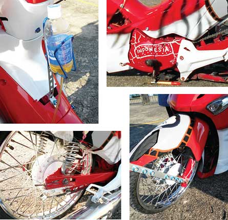Tidak hanya dari konstruksi suspensi dan roda-roda, tetapi juga pernak-pernik khas ceper, dari platnom custom menjentar ke depan, hingga selang ke tangki bensin yang ditandem botol Pocari Sweat. Pastinya, Satrio masih mengutamakan tampilan luar yang enak dipandang.